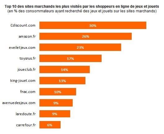 Selon le baromètre JDN / Kantar Media Compete France, ce sont deux pure players qui ont généré le plus de trafic, Cdiscount en tête, suivi par Amazon. Ils devancent les enseignes spécialisées Eveiletjeux.com (maintenant Oxybul), ToysRus.com, Joueclub.fr et King-jouet.com. Voir graphique ci-dessous.