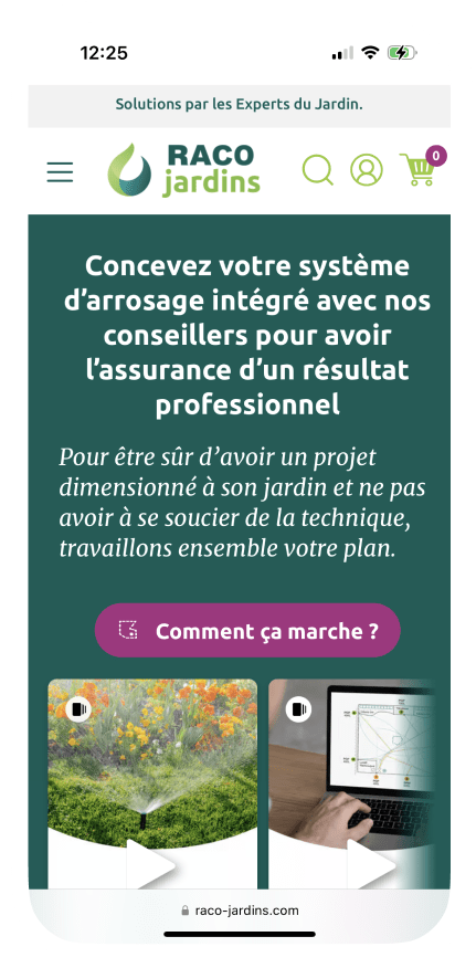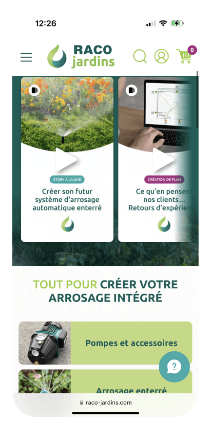 Nous avons mis en place un site Prestashop pour des performances e-commerce optimales. La page dédiée à la conception d’un plan d’arrosage automatique a été conçue en recherchant une expérience utilisateur fluide. Côté création, nous avons également intégré deux webstories sur la page d’accueil avec l’outil Join.